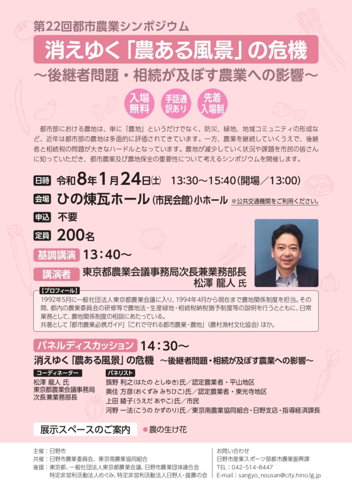 都市部における農地は、単に「農地」というだけでなく、防災、緑地、地域コミュニティの形成など、近年は都市部の農地は多面的に評価されてきています。一方、農業を継続していくうえで、後継者と相続税の問題が大きなハードルとなっています。農地が減少していく状況や課題を知り、都市農業及び農地保全の重要性について考えるシンポジウムです。