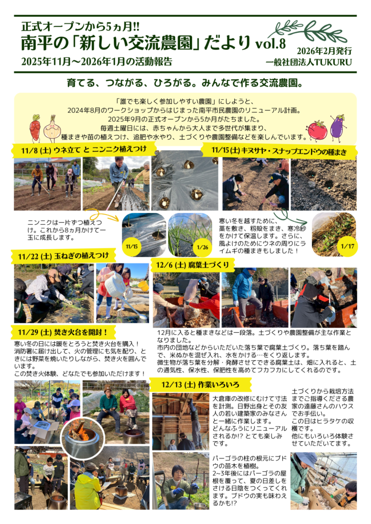 ホーム > お知らせ > お知らせ 南平の「新しい交流農園」だより 8号 ができました! 2026年3月8日 「誰でも楽しく参加しやすい農園」にしようと、おととし8月のワークショップからはじまった南平市民農園のリニューアル計画。9月の正式オープンから5ヵ月がたちました。毎週土曜日には、赤ちゃんから大人まで多世代が集まり、みんなで一緒に農園づくりを楽しんでいます。その活動の8月~10月の記録です。ぜひ、ご覧ください。 Twitter Share Pocket Hatena LINE URLコピー -お知らせ -南平交流農園, 循環, 日野市, 農のある暮らし, 農地保全, 都市農業
