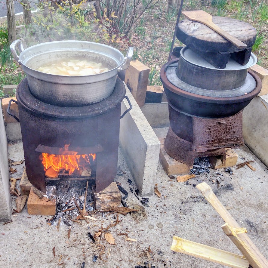 10:00集合 10:15かまどご飯準備 →畑へ移動→のらぼう菜の収穫・菜の花摘み→庭で竹切り